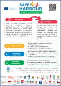 The project seeks to strengthen the capacity of European NOCs and Federations to address safeguarding concerns by identifying gaps, developing a European Response framework, and fostering collaboration. This framework will be adapted to national contexts, complemented by training and awareness initiatives to enhance safeguarding measures at both national and European levels. Therefore, SAFE HARBOUR aims to equip partner NOCs and Federations with the tools and confidence to implement effective safeguarding measures while establishing a robust support network for Safeguarding Officers and laying the groundwork for a future IOC Regional Safeguarding Hub.